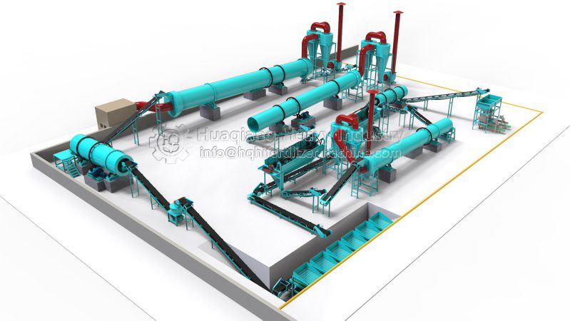 The coating process of a NPK fertilizer production lines involves the following steps: First, coating solution preparation: Dissolve the coating material (e.g., polyvinyl alcohol + kaolin) in water according to a specified ratio, stirring until homogeneous and free of sediment (concentration 8%-12%). Second, preheating: Raise the coating machine temperature to 80-90℃ and adjust the rotation speed to 25 r/min. Third, coating and drying: Feed qualified granules into the coating machine, simultaneously spraying the coating solution, controlling the spraying speed and granule feeding speed to ensure each granule is evenly coated, and continuously dry with hot air to solidify the coating layer. Fourth, finished product cooling: Send the coated granules to a cooler (cooling to room temperature) to prevent the coating layer from cracking.